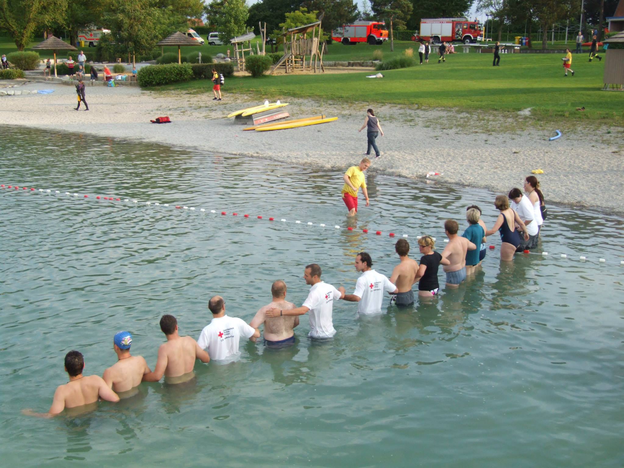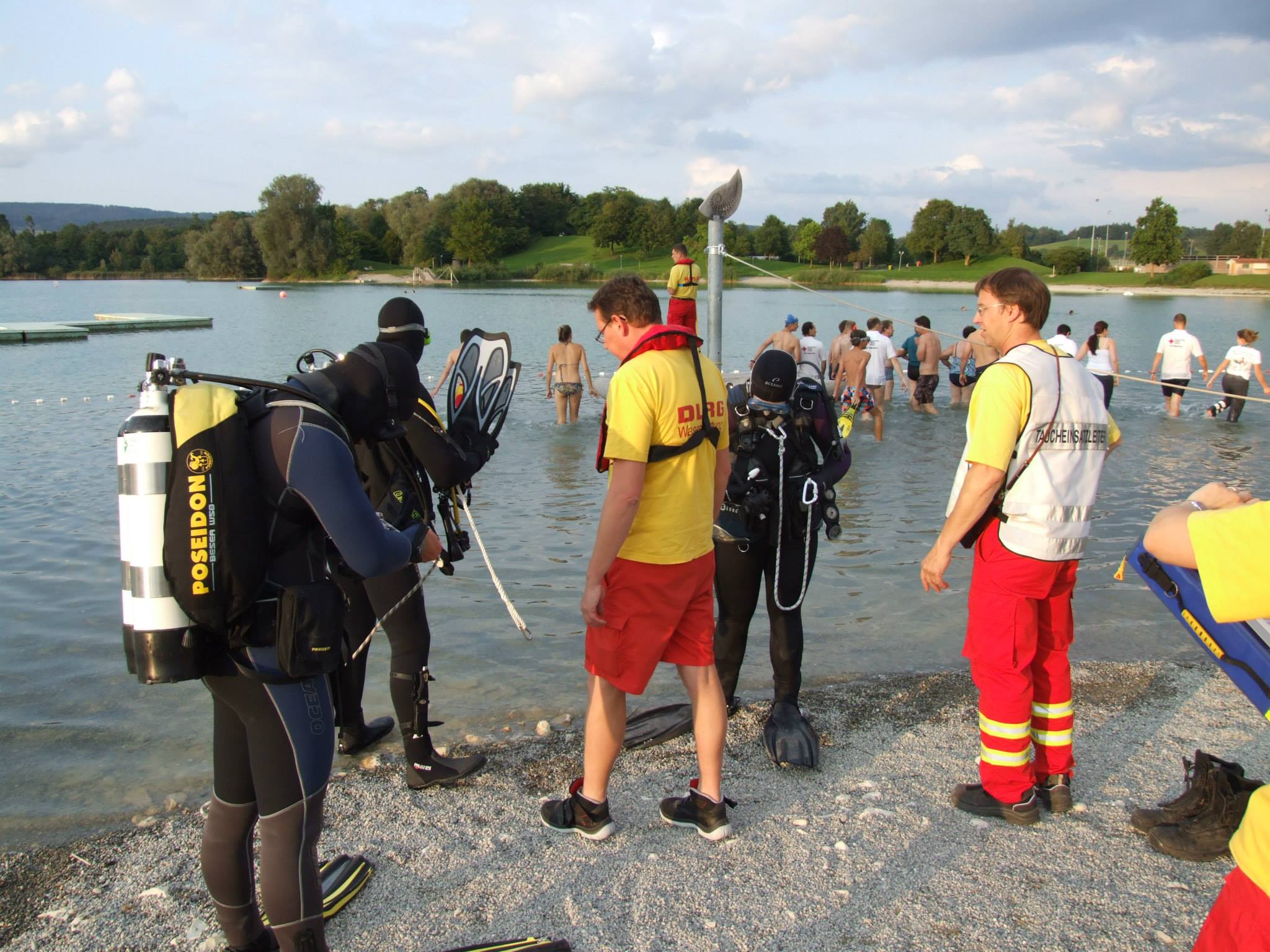 tatsächlich praktischen Teil der Personensuche zu organisieren. Dazu wurden Menschensuchkette gebildet und die begehbare Uferrand Schritt für Schritt abgeschritten. Im tieferen Gewässerbereich, waren Taucher der Deutschen Lebensrettungsgesellschaft (DLRG) eingesetzt sowie ein Boot zur weiteren Koordination.