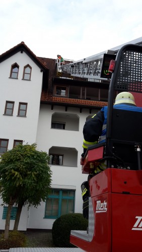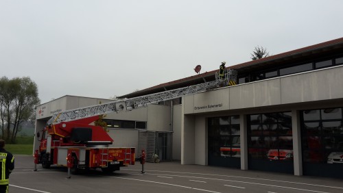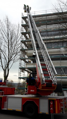 Der zweite Tag wurde dann komplett für Anleiterübungen an verschiedenen Objekten – Mehrfamilienhäuser & Industriegebäude – in der Gemeinde Salem genutzt. Dabei waren immer 3 Mann für die Drehleiter zuständig während 3 weiter Kameraden diese bei ihrem Vorgehen beobachteten und sich Notizen machten. Ein Kamerad war für die Sicherheit zuständig und beobachtete die jeweilige Übung, um im Notfall jederzeit eingreifen zu können. Mit jeder Übung wurden die Kameraden in ihrer jeweiligen Aufgabe sicherer und erkannten mögliche Hindernisse bereits schon bei der Erkundung des Objektes. Auch wurde der Notbetrieb geübt, d.h. beim Ausfall des Zentralrechners ist eine Steuerung der Drehleiter nur noch durch das manuelle Betätigen der Ventile möglich um die Drehleiter beispielsweise aus dem Gefahrenbereich zu drehen bzw.- einzufahren.