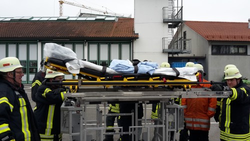Zuerst wurde die Leiter „vermessen“, d.h. es wurden die unterschiedlichen Maße der Leiter ausgemessen und notiert – Abstand der Stützen zum Podest bei maximaler und minimaler Abstützung, Überstand des Drehkranzes über das Podest hinaus, Auszugslänge der Drehleiter bei 3-Mann-, 2-Mann- und 1-Mann-Freistandsgrenze bzw.- mit leerem Korb. Nach der Mittagspause folgten die ersten Anleiterübungen am Rettungszentrum hinter dem Feuerwehrhaus, sowie das Montieren des Wenderohrs und der Krankentragenhalterung. Bei zweitem kamen noch die Kollegen des Regelrettungsdienstes hinzu und wir konnten ausprobieren, ob deren Tragen auf unsere Halterung passt. Ergebnis: Passt!