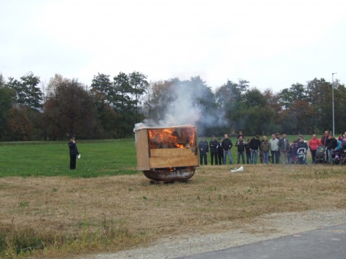 Noch während den Aufräumarbeiten vom Verkehrsunfall, entzündete sich auf einer nahen Wiese ein kleiner Holzschuppen und drohte sich zu einem größeren Flächenbrand auszubreiten.