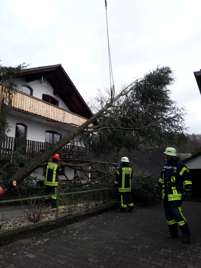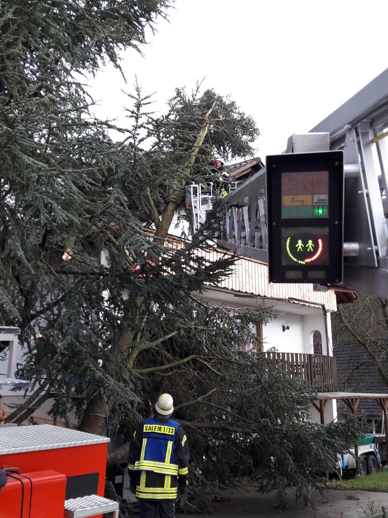 Der dritte Sturmeinsatz an diesem Tage sollte etwas länger dauern. In Mittelstenweiler im Laim hatte ein durch dem Sturm entwurzelter Baum sich im Giebel eines Wohnhauses verfangen. Die anrückenden Kräfte mußten rasch feststellen, dass weder Drehleiter noch Rüstwagen ausreichend waren, um die Lage in Griff zu bekommen. Hier mußte ein 40 Tonnen Kran eines ortsansäßigen Bauunternehmens eingesetzt werden, um den Baum vom Giebel zu entfernen. Während des gesamten Einsatzes war die Polizei ebenfalls vor Ort.