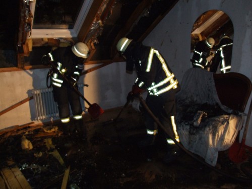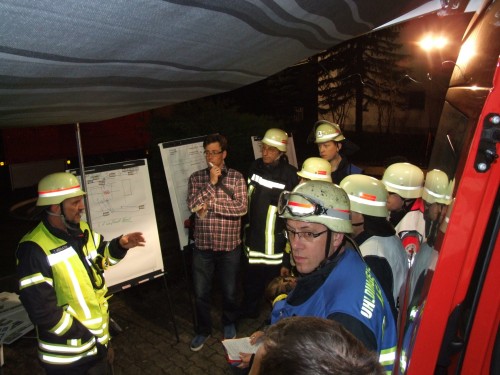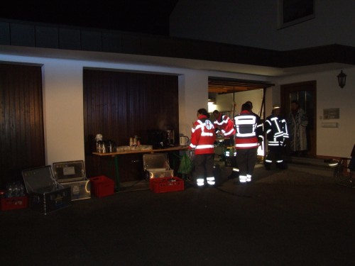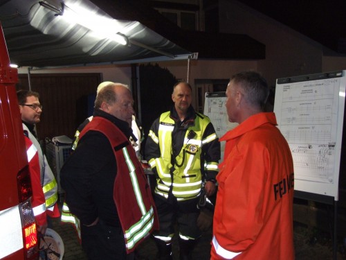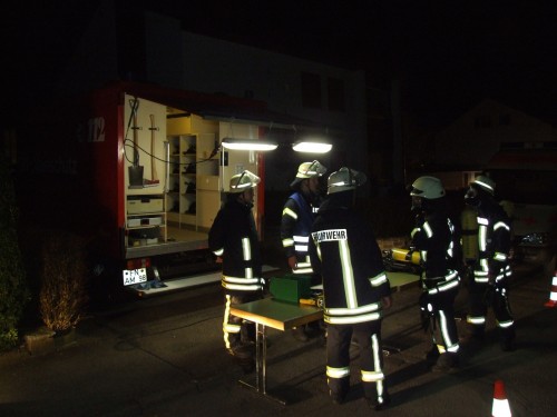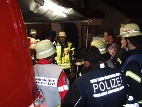 freiwilligen Feuerwehr Salem – „unklare Rauchentwicklung im Dachgeschoss!“ Ein aufmerksamer Anwohner hatte zuvor eine starke Rauchentwicklung vom Dachstuhl eines benachbarten Mehrfamilienhauses in Mimmenhausen wahrgenommen. Rasch warnt dieser die noch sorglosen Bewohner, welche daraufhin ihre Wohnungen zügig verlassen und vor Eintreffen der Feuerwehr sich in Sicherheit befinden. Ein Löschversuch durch den Eigentümer der betroffenen Dachgeschoßwohnung, die zur Zeit unbewohnt ist, misslingt. Das schnelle Eintreffen der Feuerwehr Salem verhindert ein Übergreifen der Flammen auf die angrenzende Doppelhaushälfte. 89 Einsatzkräfte sind teilweise bis zu sechs Stunden im Einsatz. Feuerwehren aus Uhldingen-Mühlhofen und Markdorf unterstützen die Löscharbeiten. Feuerwehreinsatzkräfte aus Heiligenberg und Frickingen stellen zusammen mit der Feuerwehr Salem die Führungsgruppe, die den Einsatzleiter vor Ort bei seinen Aufgaben unterstützt. Die DRK-Schnelleinsatzgruppe Salemertal betreut betroffene Anwohner und Einsatzkräfte der Feuerwehr. Ein Rettungswagen der Rettungswache Salem steht für die Notfallversorgung bereit. Die Polizei ermittelt die Brandursache. Bürgermeister Herr Härle eilt von einer Sitzung in Stuttgart- Schönbuch nach Salem zur Einsatzstelle. Lange bleibt das entstehende Feuer einer momentan unbewohnten Dachgeschoßwohnung in Mimmenhausen unbemerkt. Ein aufmerksamer Nachbar registriert gegen 20:15 Uhr eine starke Rauchentwicklung im Dachgeschoß eines Mehrfamilienhauses an der rechten Doppelhaushälfte. Der Nachbar warnt die nichtsahnenden Bewohner vor der drohenden Gefahr und diese können sich vor Eintreffen der Feuerwehr in Sicherheit bringen, somit sind keine Personen mehr in Lebensgefahr. Brand droht außer Kontrolle zu geraten Der Löschversuch des Eigentümer mit Hilfe von Bekannten scheitert aufgrund der schon weit fortgeschrittenen Brandausdehnung. Die Beteiligten retten sich daraufhin ins Freie. Fünf Minuten nach Alarmierung durch die Rettungsleitstelle trifft das erste Löschgruppenfahrzeug (LF16/20) an der Einsatzstelle ein. Kurze Zeit danach sind die Drehleiter (DLK 23/12), das Tanklöschfahrzeug (TLF 16/25) und der Einsatzleitwagen (ELW 1) an der Einsatzstelle. Der Dachstuhl steht in Vollbrand, kurz vor Eintreffen des ersten Löschfahrzeuges kam es zur Durchzündung. Flammen lodern, Gebälk ist sichtbar, einzelne Dachziegel fallen herab, ein Übergreifen der Flammen auf die benachbarte Doppelhaushälfte droht. Anforderung weiterer Kräfte Der Einsatzleiter erkennt schnell die prekäre Lage und fordert weitere Löschfahrzeuge und Atemschutzgeräteträger an. Die Alarmierungsstufe wird von F2 auf F3 erhöht. Ein weiterer Zugalarm durch die Leitstelle fordert den dienstfreien Zug der Feuerwehr Salem an. Der Schlauchwagen (SW2000) und der Rüstwagen (RW2), sowie ein Mannschaftstransportwagen (MTW1), besetzt mit acht zusätzlichen Atemschutzgeräteträgern, rücken kurze Zeit später zur Einsatzstelle nach. Alarm für die Einsatzabteilungen Beuren und Weildorf zur Sicherstellung des Brandschutzes oder um weitere Hilfeleistungseinsätze im Gemeindegebiet übernehmen zu können. Im Rahmen der Überlandhilfe rücken die Feuerwehr Uhldingen-Mühlhofen mit einem Tanklöschfahrzeug und einer weiteren Drehleiter zur Einsatzstelle aus, sowie die Feuerwehr Markdorf mit dem Gerätewagen Atemschutz (GWA). Mitglieder der Freiwilligen Feuerwehr Heiligenberg und Frickingen, die sich kurz zuvor zu einer Probe der übergemeindlichen Führungsgruppe Salem im zentralen Gerätehaus Salem eingefunden hatten, besetzen zusammen mit Feuerwehrsprechfunker aus Salem den Einsatzleitwagen und unterstützen den Einsatzleiter vor Ort. Aufrechterhalten der Kommunikationsverbindung zur Leitstelle, Kräftenachforderung, Führen einer Lagekarte, Kräfteübersicht, Einsatztagebuch und Schadenskonto sind ihre Aufgaben. Brandbekämpfung unter Atemschutz Während weitere Kräfte nachrücken, rüsten sich Atemschutzgeräteträger der ersteingetroffenen Löschfahrzeuge aus, Löschschläuche werden ausgerollt, Verteiler gesetzt, Feuerlöschkreiselpumpen heulen auf. C-Schläuche, gefüllt mit Löschwasser, führen durch das Treppenhaus nach oben zum Brandherd. Unter Atemschutz bekämpfen die Floriansjünger das Feuer im Dachgeschoß, eine nicht ganz einfache Aufgabe, denn dichter Rauch behindert zusätzlich die Sicht und macht den Einsatz der Wärmebildkamera erforderlich. Ein schnelles Vordringen zum Brandherd ist zeitweise von innen her nicht möglich, da sich das Feuer über die Zwischenräume ausbreitet. Eingesetzte Atemschutztrupps schaffen Öffnungen in Wänden und Decken um das Feuer mit dem Hohlstrahlrohr löschen zu können. Der Zutritt zum Dachboden bleibt verwehrt, da die dazugehörende Aufstiegsleiter der Luke durch die Hitzeentwicklung im Dachfirst instabil geworden ist. Ein weiteres Vordringen ist vorerst zu gefährlich. Dachziegel und verkohltes Gebälk fallen auf die eingezogene Zwischendecke herunter. Um eine weitere Ausbreitung der Flammen zu verhindern, versuchen Atemschutzgeräteträger mit Hilfe der Drehleiter von außen über das Dach an den Brandherd zu gelangen. Dachziegel werden vom Dachstuhl entfernt um das Dach zu öffnen. Ein weiterer Atemschutztrupp übernimmt die Aufgabe der Riegelstellung und begibt sich in die benachbarte Doppelhaushälfte ins Dachgeschoß, um ein Übergreifen der Flammen zu verhindern. Zwei benzinbetriebene Druckbelüfter drücken giftigen Brandrauch aus dem Gebäude. Löschwasserversorgung für mehrere Einsatzfahrzeuge Die Löschwasserversorgung ist rasch aufgebaut, alle in der Nähe liegenden Hydranten speisen mehrere Löschfahrzeuge mit Wasser. Um eine Überlastung der Wassernetze durch eine weitere Löschwasserversorgung zu vermeiden , legt die Besatzung des Schlauchwagens (SW 2000) eine doppelte Schlauchleitung von einem weit entfernten Hydranten zur Einsatzstelle, für den Fall, dass das Feuer übergreift und größere Mengen an Löschw