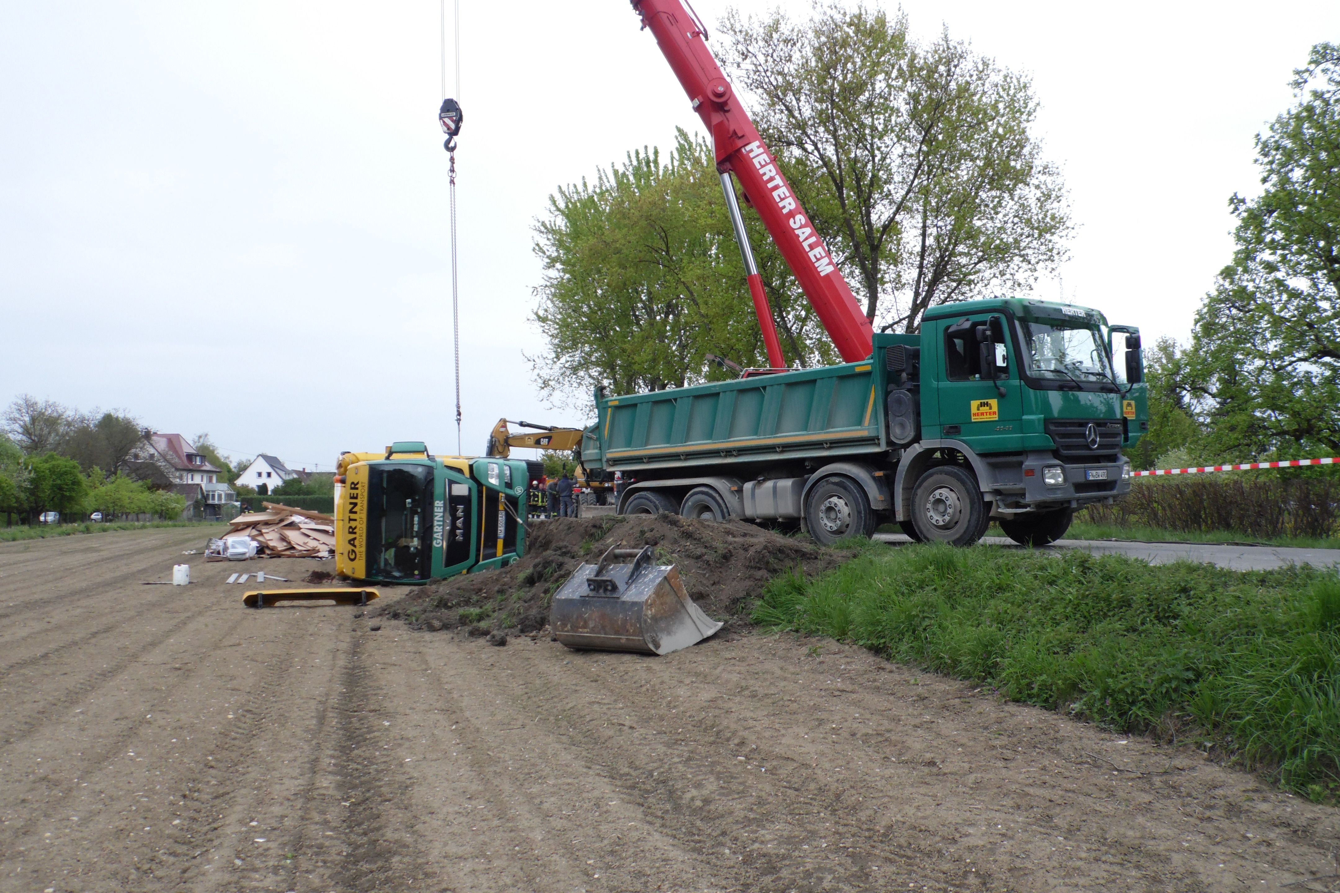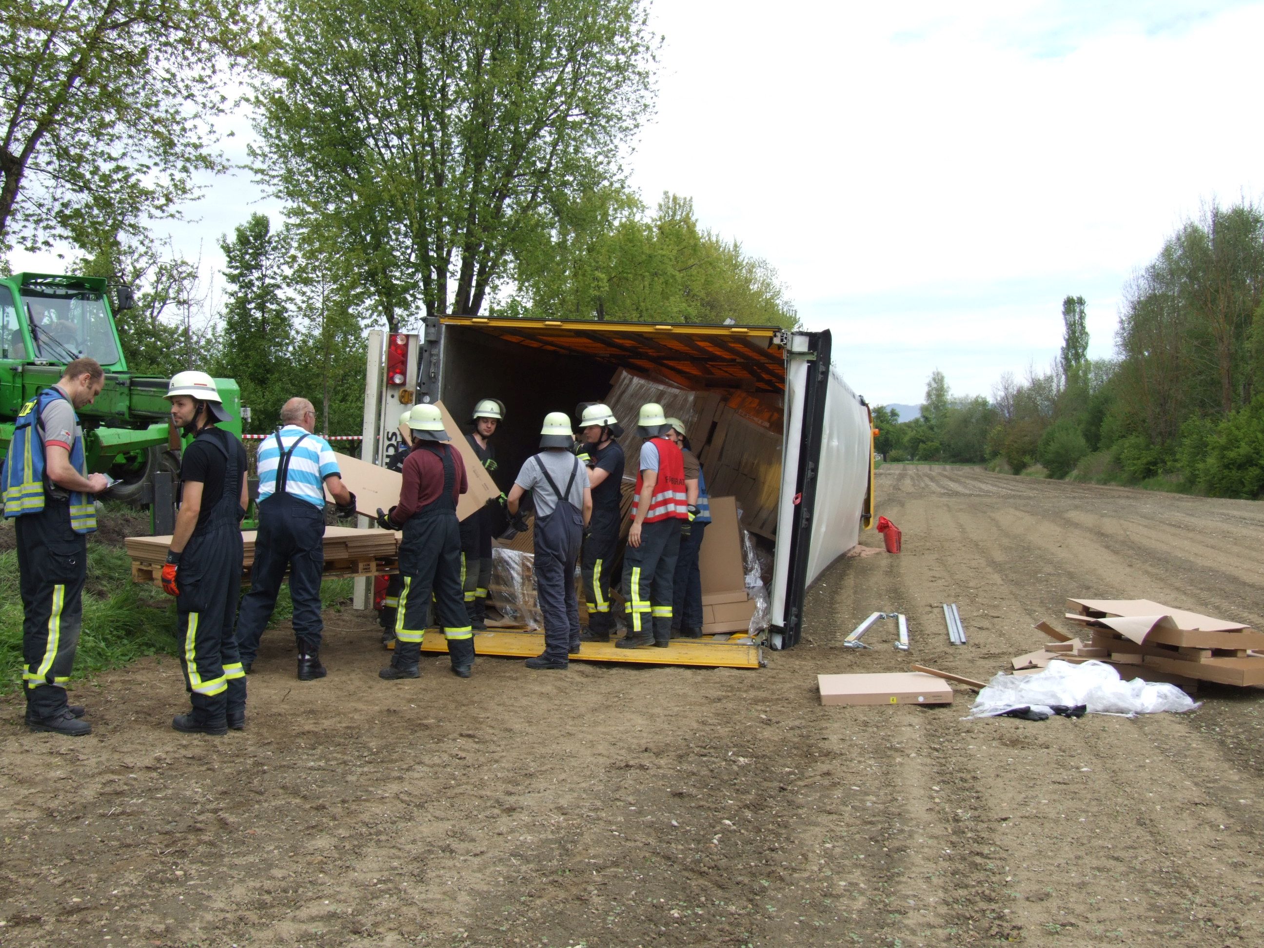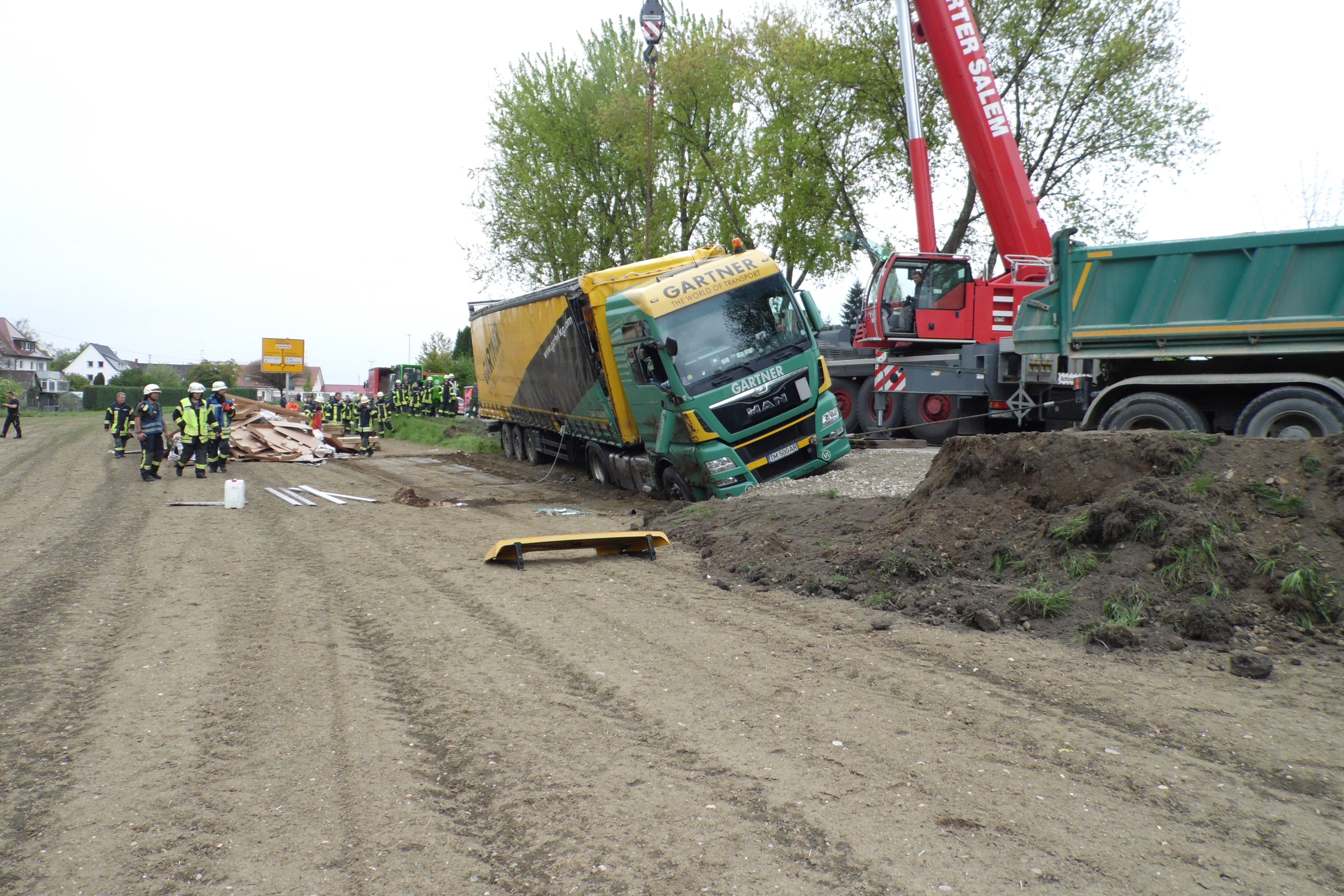 Die Erkundung ergab, dass der Auflieger voll beladen mit einer Lieferung für eine große Möbelhauskette war. Um das Fahrzeug wieder aufrichten zu können, musste der Auflieger komplett entladen werden. Dies konnte nur von Hand erfolgen, weshalb sich der Einsatz mehrere Stunden hinzog. Unterstützt bei der Bergung wurde die Kräfte durch ortsansässige Firmen, welche Stapler, Paletten und LKW mit Anhänger zur Verfügung stellten um die Ladung zu bergen. Gegegn 17:00 Uhr konnten dann Mitarbeiter der Salemer Firma Härter die Bergung des Sattelzugs durchführen. Hierfür wurde eine provisorische Rampe errichtet und Zugmaschine mit Auflieger mit einem 90 Tonnen Kran aufgerichtet. Schliesslich musste ein Teil des Erdreiches abgetragen werden, da aus dem Tank des Unfalllasters größere Mengen Diesel ins Feld liefen. | ||