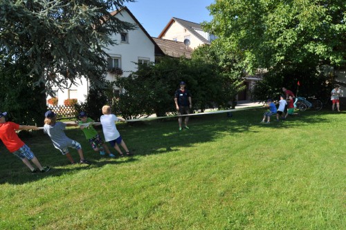 Der Abschluss fand dann wie jedes Jahr üblich auf dem Hof von Willi Lorch statt. Während das Feuer für Grillwürste und Stockbrot angefacht wurde, wurde es beim Tauziehen nochmal sportlich. Erschöpft und satt wurden die Kinder dann mit dem Feuerwehrauto nach Hause gebracht.
