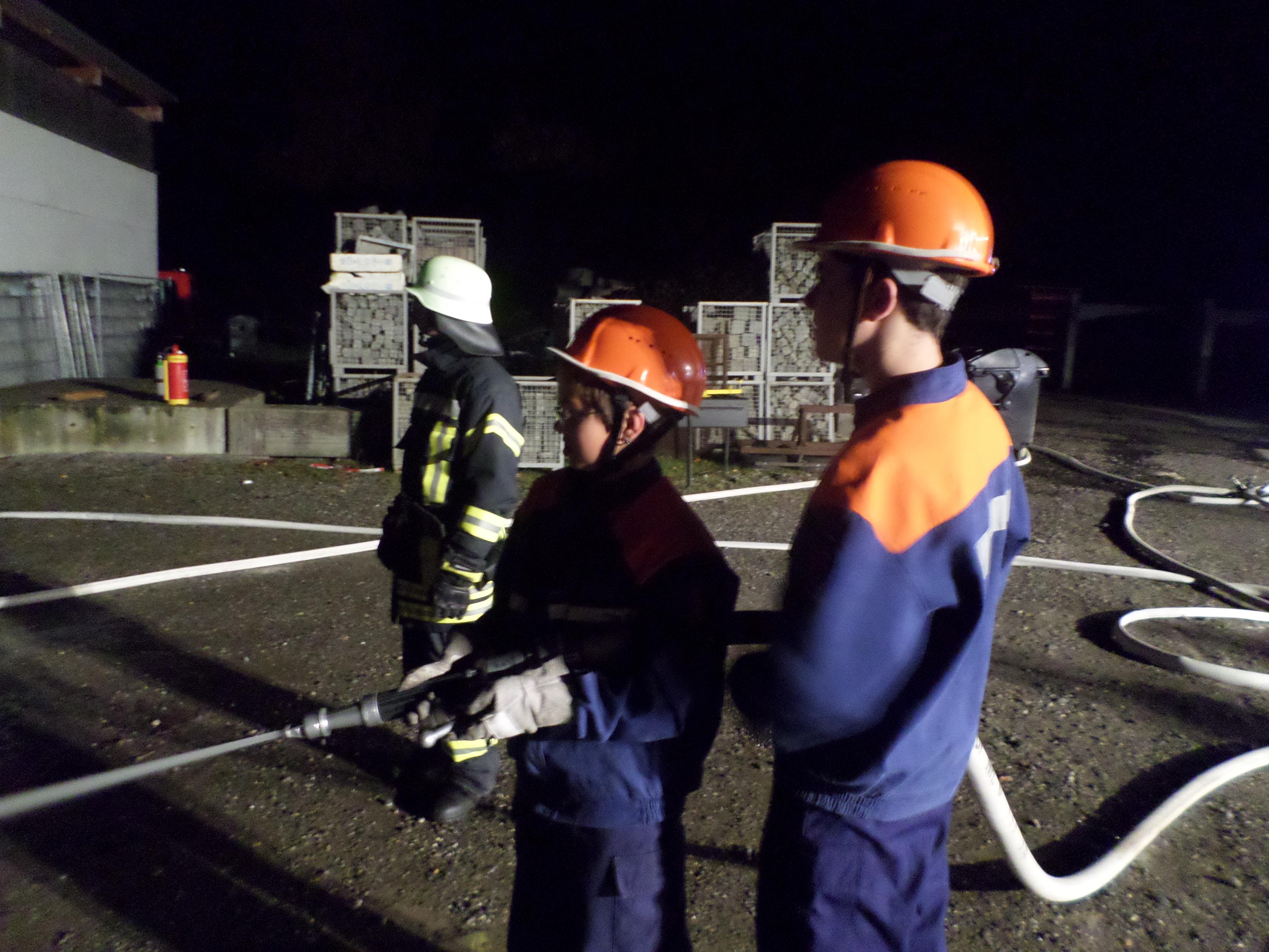 Ein vorbereiteter Kleinbrand auf dem Bauhofgelände Salem, beaufsichtigt durch die Gruppenleiter der Jugendfeuerwehr, muss schnellst möglichst gelöscht werden.