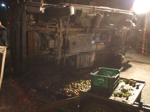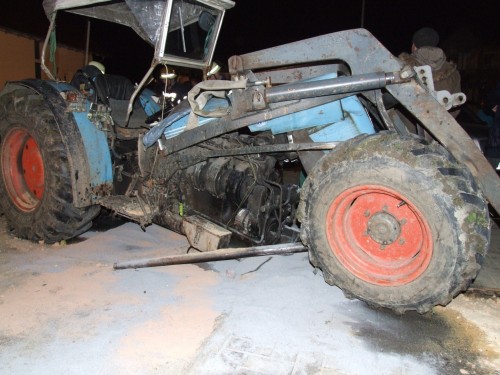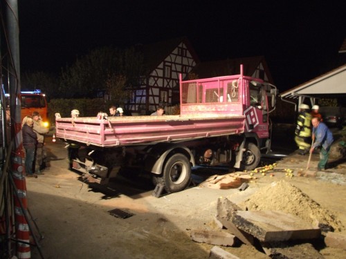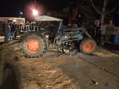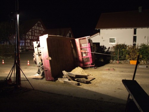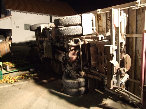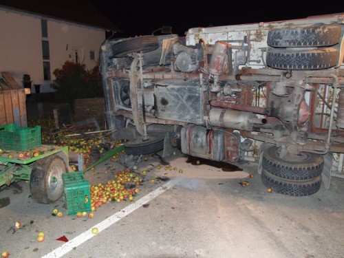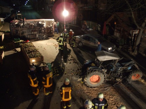 Rickenbach der Feuerwehr Salem zu Aufräumarbeiten nach einem Verkehrsunfall in der Lippertsreuter Straße in Rickenbach gerufen. Laut Meldung der Leitstelle sollen nach einem Zusammenstoß eines Traktors mit einem LKW Betriebsstoffe auslaufen. Verletzte soll es keine geben. Vor Ort stellte sich die Lage jedoch etwas anders da, als sie in der Alarmmeldung vermuten lies. Nach einem Zusammenstoss beider Fahrzeuge, der Hergang ist der Feuerwehr nicht bekannt, lag der LKW um 90° gedreht quer auf der Strasse. Zum Liegen kam der LKW dann auf dem hinteren der beiden Obstanhänger, wobei die dort geladenen Holzkisten zerstört wurden und sich ca. 900kg Äpfel auf der Straße verteilten. Ein auf dem Seitenstreifen stehender Pkw, dessen Fahrer gerade beim Einkaufen am dortigen Obststand war, wurde vom Heck des schleudernden LKW erfasst und erheblich beschädigt. Entgegen der 1. Meldung wurde der Fahrer des Traktors bei dem Zusammenstoß verletzt und wurde von der Besatzung eines vorsorglich alarmierten Rettungswagen zur weiteren Behandlung in ein Krankenhaus verbracht. Der Fahrer des LKW blieb unverletzt. Die primäre Aufgaben der Feuerwehr bestand darin, austretende Betriebsstoffe aus Traktor und LKW aufzunehmen sowie die Unfallstelle abzusichern und auszuleuchten. Nachdem die Beamten der Polizei die Spuren vor Ort soweit gesichert hatten, wurden durch die Feuerwehrkameradinnen und - kameraden die Äpfel aufgesammelt, bevor man an die Bergung des umgestürzten LKW's gehen konnte. Gesichert durch den Greifzug, wurde der LKW langsam mit der Winde des RW2 aufgerichtet, so dass es zu keinen weiteren Beschädigungen am Fahrzeug kam. Nach dem die Unfallstelle komplett gereinigt war wurde Sie an die Polizei übergeben und die Kameradinnen und Kameraden konnten wieder in ihre Unterkünfte einrücken. Insgesamt war die Feuerwehr Salem mit 21 Kräften und 5 Fahrzeugen im Einsatz. | ||