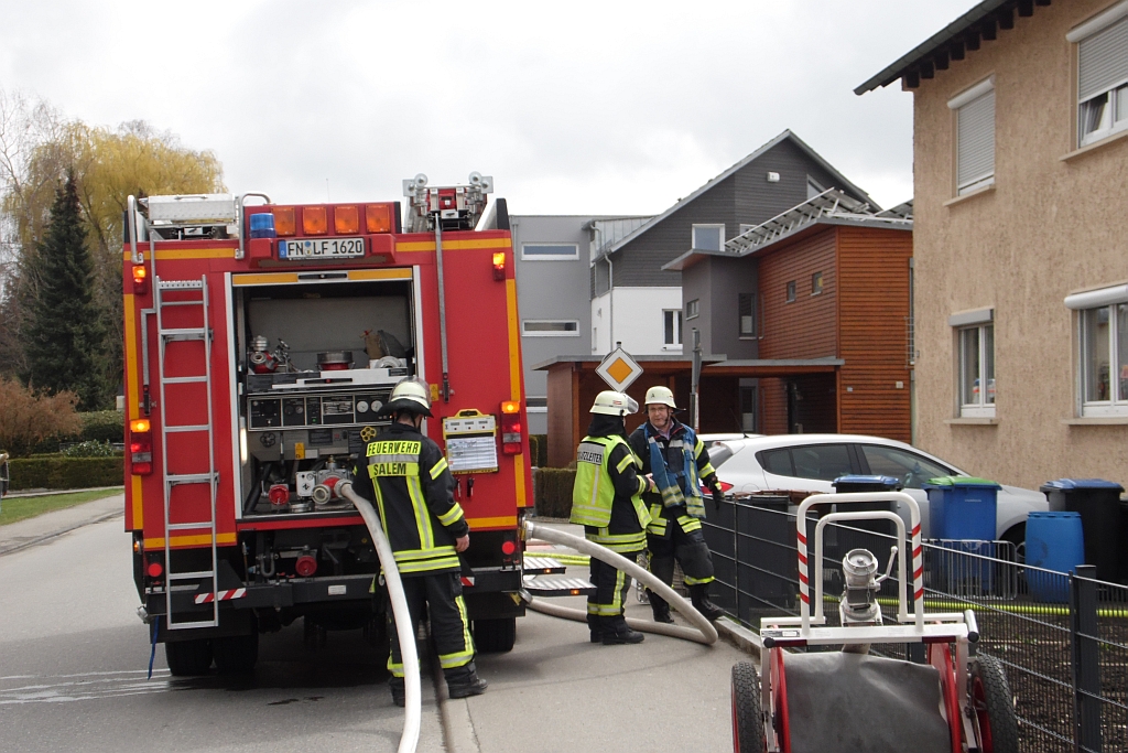 Zu einem Wohnungsbrand in der Bahnhofstraße wurde die Feuerwehr Salem am Freitagmorgen um 11:05 alarmiert. Der Anrufer meldete bei der Leitstelle Bodensee-Oberschwaben ein brennendes Fernsehgerät. Beim Eintreffen der ersten Kräfte hatte sich der Brand auf das gesamte Zimmer ausgebreitet. Mit 2-C Rohren und 3 Atemschutztrupps konnte die Feuerwehr bereits 10 Minuten nach dem Eintreffen "Feuer aus" melden. Die Nachlöscharbeiten und Lüftungsmaßnahmen zogen sich allerdings noch einige Zeit hin. Drei Bewohner konnten sich noch vor dem Eintreffen der Feuerwehr in Sicherheit bringen. Sie wurden vom DRK betreut und mit Verdacht auf Rauchvergiftung ins Krankenhaus gebracht. Neben dem Regelrettungsdienst war auch die SEG Salemertal vor Ort im Einsatz. Beamte der Landespolizei nahmen weitere Ermittlungen auf. Während des Löscharbeiten musste die Bahnhofstraße für den Verkehr komplett gesperrt werden.