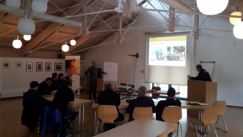 Zu Beginn der 2 Tage wurden den Teilnehmern theoretisch die Grundlagen beim Einsatz mit der Drehleiter vermittelt. Hindernisse, Abstände, Kontrolle des Untergrundes und allgemein die Sicherheit – kurz um die HAUS – Regel – sind 4 Punkte die bei jedem Einsatz und bei jeder Übung mit der Drehleiter vor dem Aufstellen beachtet werden müssen, damit der gewünschte Einsatzerfolg eintreten kann. Des Weiteren wurden die Vor- und Nachteile unterschiedlicher Anleitervarianten (Frontal, Vertikal, Horizontal) angesprochen, bevor man dann in den Hof wechselte um mit der praktischen Ausbildung zu beginnen.
