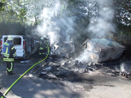Glücklicherweise konnte kurz nach dem Eintreffen der ersten Kräfte Entwarnung gegeben werden. Es brannte ein Wohnwagen im Außenbereich in voller Ausdehnung, wobei das Feuer bereits auf einen direkt daneben stehenden Transporter übergegriffen hatte. Sofort wurde vom Angriffstrupp des LF16 mit dem Schnellangriff die Brandbekämpfung eingeleitet, während der 2te Trupp sich mit Atemschutz ausrüstetet und ebenfalls mit einem C-Rohr die Brandbekämpfung unterstützte. Bereits nach kurzer Zeit war der Brand soweit unter Kontrolle, dass ein großer Teil der alarmierten Kräfte aus dem Einsatzgeschehen herausgelöst werden konnten und die Einsatzstelle verlassen konnten. Nachdem die Nachlöscharbeiten abgeschlossen waren, konnten auch die letzten Kräfte nach etwas mehr als einer Stunde die Einsatzstelle verlassen und ins Gerätehaus einrücken. Weitere Kräfte vor Ort: Landespolizei BW, Rettungsdienst | ||
