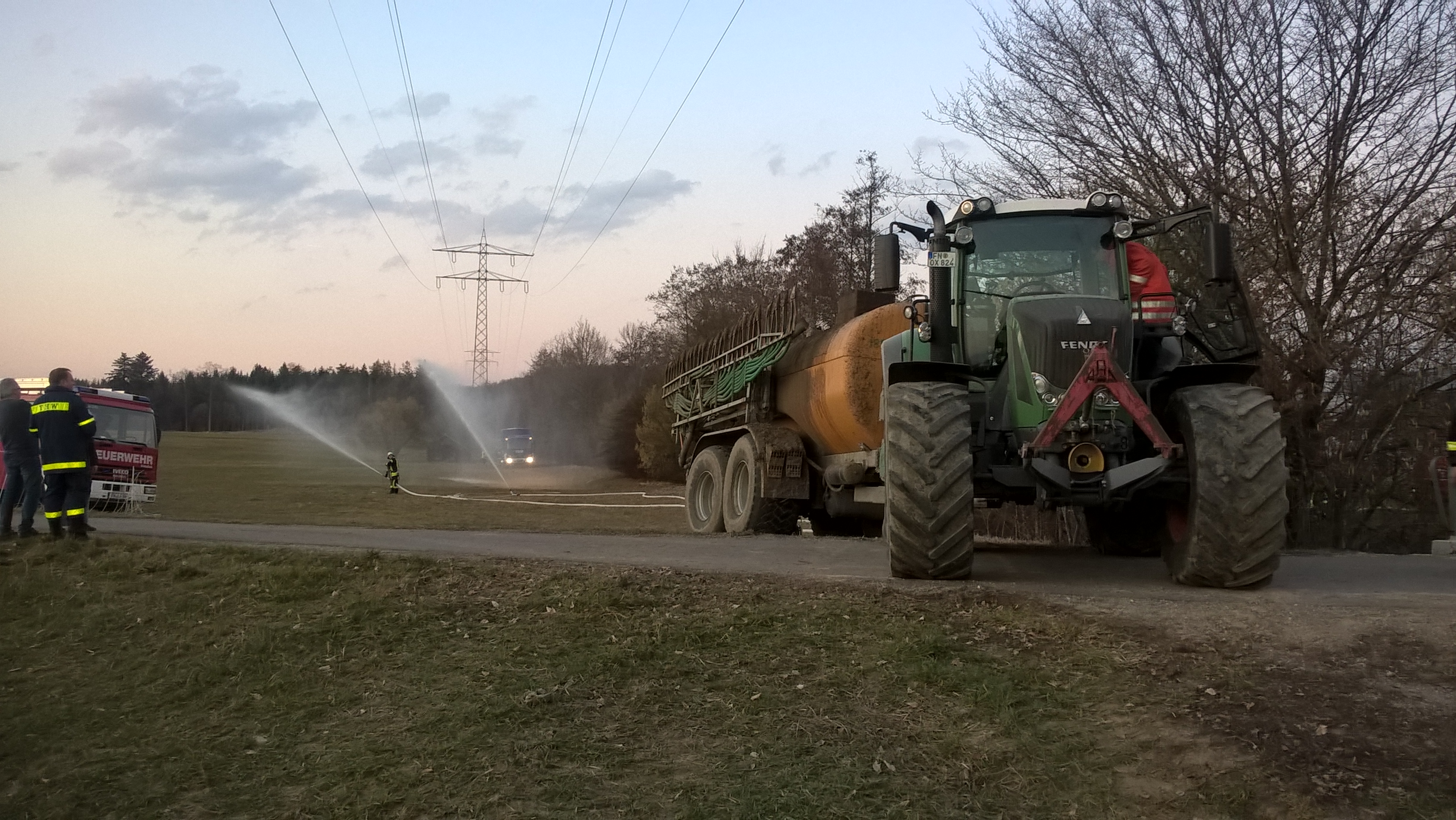 Deggenhausertal waren mehrere 1000 Liter Gülle in die Aach geflossen. Gegen 17:45 erreichte die Wasserverunreinigung die Brücke am Fischerhaus auf der Gemarkung Neufrach. Hier hatten die Einsatzkräfte bereits mehrere Pumpen in Stellung gebracht. Unterstützung kam vom THW Überlingen mit einer Großpumpe und einem Landwirt mit zwei Pumpfässern. Durch diese Maßnahmen wurden in der Minute 12.000 Liter Wasser/Güllegemisch aus der Deggenhauser Aach abgepumpt und auf umliegenden Felder ausgebracht. Gegen 21:00 Uhr konnte der Einsatzleiter feststellen, dass keine Gülle mehr im Bachwasser heranfloss, so dass die Pumparbeiten eingestellt werden konnten. Umfangreiche Aufräum- und Reinigungsarbeiten schlossen sich an. Unter Anderem kam ein Holztransportfahrzeug mit Kran zum Einsatz, um Heurundballen aus der Aach zu bergen, welche zuvor zum Aufstauen des Bachs von den Einsatzkräften eingebracht wurden. Gegen 23:30 Uhr war die Feuerwehr Salem wieder einsatzbereit. | ||