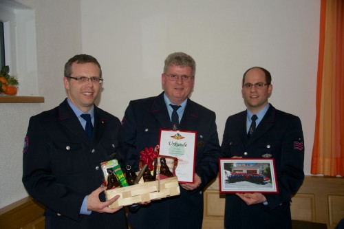 Gerhart Mayer wurde für 25 Jahre aktiven Dienst bei der FFW Beuren geehrt. Er hat in dieser Zeit zahlreiche Lehrgänge besucht. Es gratuliert der Abteilungskommandant Martin Weißhaupt und sein Stellvertreter Tobias Weber und überreichten einen Geschenkkorb samt Urkunde.