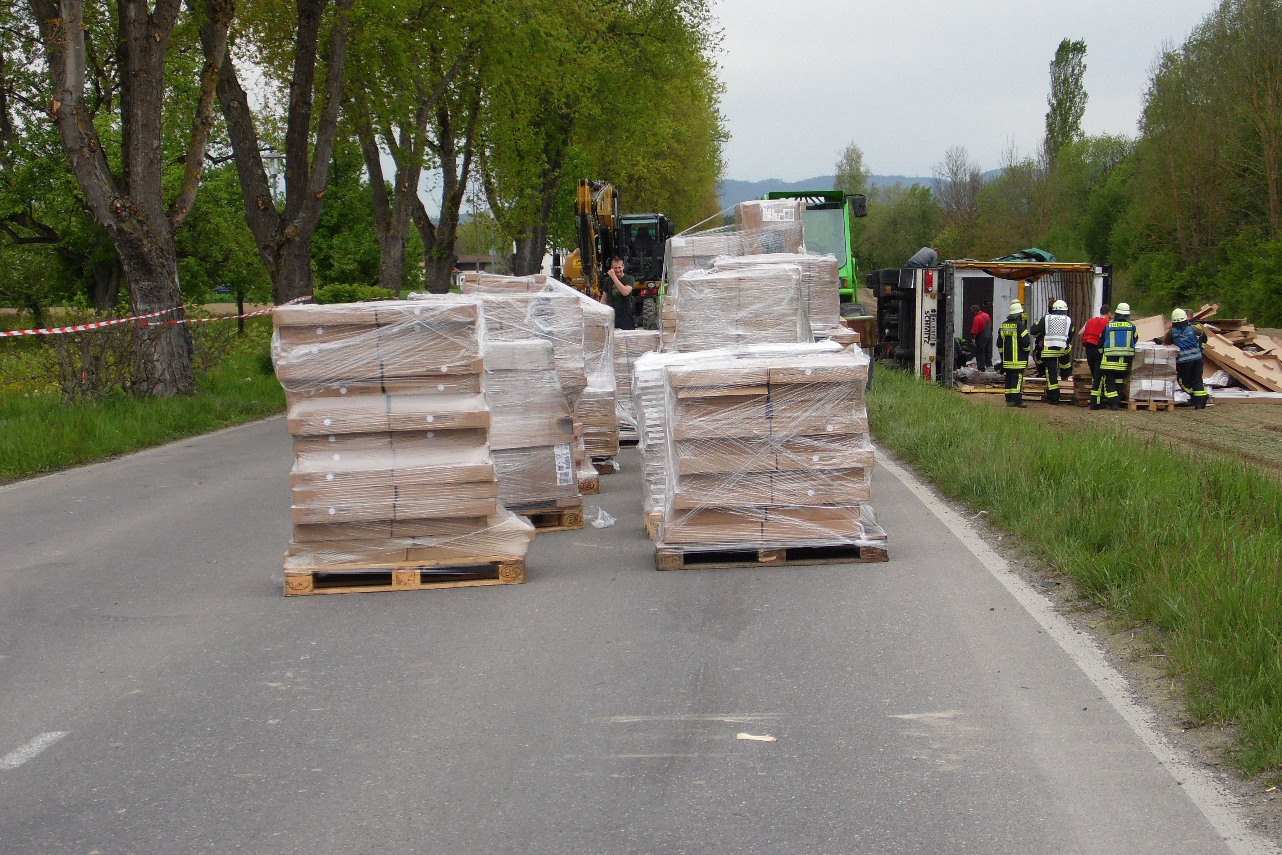 Die Erkundung ergab, dass der Auflieger voll beladen mit einer Lieferung für eine große Möbelhauskette war. Um das Fahrzeug wieder aufrichten zu können, musste der Auflieger komplett entladen werden. Dies konnte nur von Hand erfolgen, weshalb sich der Einsatz mehrere Stunden hinzog. Unterstützt bei der Bergung wurde die Kräfte durch ortsansässige Firmen, welche Stapler, Paletten und LKW mit Anhänger zur Verfügung stellten um die Ladung zu bergen. Gegegn 17:00 Uhr konnten dann Mitarbeiter der Salemer Firma Härter die Bergung des Sattelzugs durchführen. Hierfür wurde eine provisorische Rampe errichtet und Zugmaschine mit Auflieger mit einem 90 Tonnen Kran aufgerichtet. Schliesslich musste ein Teil des Erdreiches abgetragen werden, da aus dem Tank des Unfalllasters größere Mengen Diesel ins Feld liefen. | ||