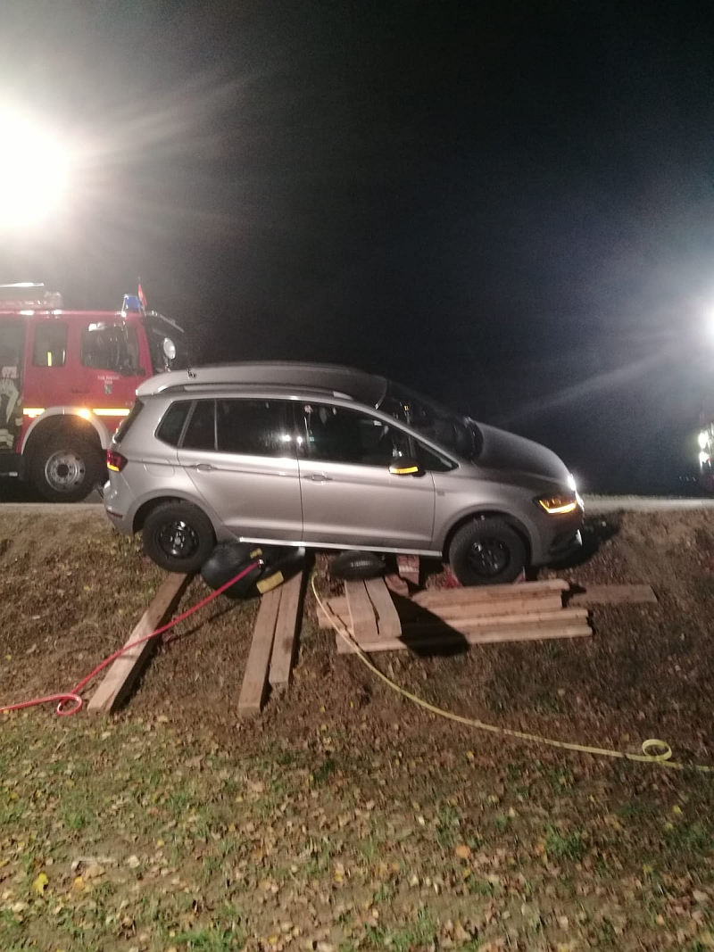 Der dritte Einsatz am 08.11.2018 führte die Feuerwehr Salem auf den Verbindungsweg zwischen Wehheim und Mittelstenweiler. Der Verbindungsweg ist aktuell ein stark befahrener Schleichweg, da die Ortsdurchfahrt Neufrach immer noch saniert wird. Beim Eintreffen der ersten Kräfte stellten diese fest, dass ein Fahrzeug von der Fahrbahn abgekommen und schräg auf dem unbefestigten Bankett stand. Der Fahrer befand sich immer noch im Fahrzeug, da die Gefahr bestand, dass das Fahrzeug weiter Abrutscht. Der eCall des relativ neuen Fahrzeugs hatte ausgelöst. Nach der Stabilisierung des PKW konnte der Fahrer unverletzt befreit werden. Um das Gefährt zu bergen, wurde ein Abschleppfahrzeug mit Kran angefordert. Bevor das Abschleppunternehmen jedoch den Havaristen an den Kranhaken nehmen konnte, musste ein weiteres Fahrzeug geborgen werden, welches nach einem Wendeversuch auf der engen Straße sich festgefahren hatte.