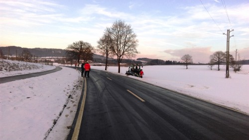 vorbei welches sich auf Grund der mittlerweile sehr glatten Fahrbahn der K7758 von der Strasse gedreht hatte. Sie sicherten die Unfallstelle ab und ein in direkter Nachbarschaft wohnender Landwirt, half unkompliziert mit seinem Traktor das Fahrzeug wieder auf die Strasse zu bekommen. Um nachfolgenden Verkehr die Gefährdungssituation zu verdeutlichen, wurden Warnschilder vom zentralen Gerätehaus an der Schloßseeallee angefordert sowie die Strassenmeisterei über die Polizei verständigt um die Strasse zu streuen. Die Fahrerin des PKW trug keine Verletzung davon und an dem Fahrzeug entstand kein sichtbarer Sachschaden. | ||