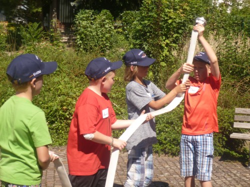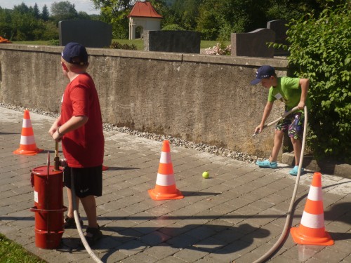 Danach ging es weiter zu den einzelnen Stationen. Wie auch bei der Einsatztätigkeit der Feuerwehr war hier vor allem Teamgeist gefragt. So musste unter anderem ein kleiner Ball schnellstmöglich durch einen 15m langen Schlauch befördert werden. Ein anderes Spiel trug den hohen Temperaturen Rechnung: Ein Tennisball musste mit Hilfe eines Wasserstrahls aus dem Schlauch einer Kübelspritze durch einen Slalomparcours geführt werden. Die Spritze musste „mühsam“ mit Hilfe einer Eimerkette von einer Schwengelpumpe aus befüllt werden. Hier ging der ein oder andere Tropfen auch mal daneben und sorgte für eine willkommene Abkühlung. An einer weiteren Station war das Zahlenschloss einer Schatzkiste zu öffnen. Die Kombination 112 war schnell erraten und neben Muffins wartete ein Funkgerät in der Kiste. Hier musste gefunkt werden, um die nächste Station zu erfahren.