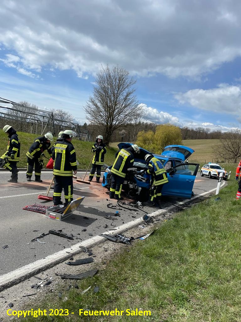 ?Auf der Landstraße L200a zwischen Stefansfeld und Tüfingen kam es kurz nach 13 Uhr zu einem Verkehrsunfall, bei de, 2 PKW beteiligt waren. In der Alarmmeldung wurde eine eingeklemmte Person angegeben. Beim Eintreffen der ersten Kräfte stellte sich das jedoch als Falschmeldung heraus. Somit beschränkte sich der Einsatz der Feuerwehr Salem auf Absperrmaßnahmen, die Sicherstellung des Brandschutzes und der Unterstützung des Rettungsdienstes. Nachdem ausgelaufene Betriebsstoffe aufgenommen waren wurde noch das Eintreffen der angeforderten Straßenmeisterei abgewartet, welche für weitere Sicherungsmaßnahmen (Aufstellen von Ölwarnschildern) angefordert wurde. Nach Abschluß der Tätigkeiten wurde die Einsatzstelle an die ebenfalls anwesende Polizei übergeben.